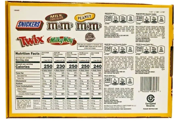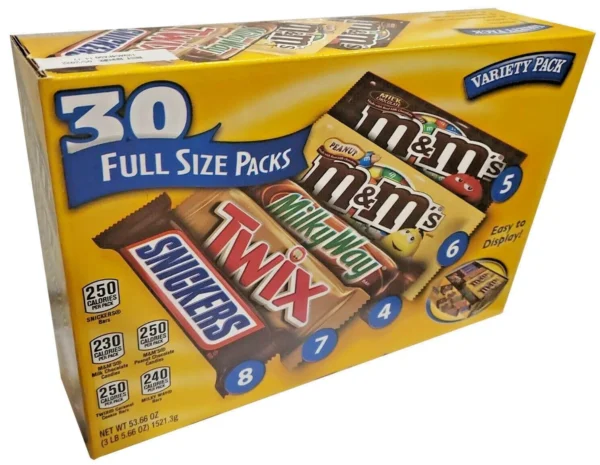 • Contains one (1) 30-count box of full-sized, individually wrapped Chocolate & Chewy Candy: (8) SNICKERS Milk Chocolate Bars, (6) M&M’S Peanut Chocolate Candy, (6) M&M’S Milk Chocolate Candy, (4) SKITTLES Original Chewy Candy, (3) STARBURST Original Chewy Candy, and (3) 3 MUSKETEERS Milk Chocolate Bars Assortment